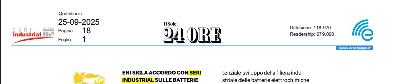 Eni and Seri Industrial announced that Eni Storage Systems, the joint venture between Eni (50% plus one share) and Fib (50% minus one share, part of Seri Industrial), has started operations in Brindisi to develop stationary lithium battery production. The project foresees a hub with over 8 GWh of annual LFP battery capacity produced with water-based processes, now in the engineering and permitting phase.